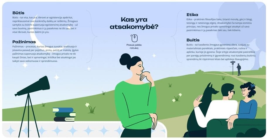 Tarpdisciplininis minčių žemėlapis bus interaktyvus ir vizualus, sieja realaus pasaulio socialinius reiškinius su pagrindiniais būties principais ir Europos vertybėmis. Jame bus interaktyviūs sąvokų ir asociacijų paaiškinimai, padėsiantys vartotojams susieti sudėtingas socialines problemas, pvz., nelygybę, socialinius tinklus, dirbtinį intelektą ir kt., su būties principais ir žmogaus būsena, pvz., laiku, pokyčiais, neapibrėžtumu, trūkumu ir kt., bei Europos vertybėmis, pvz., žmogaus orumu, laisve ir kt.