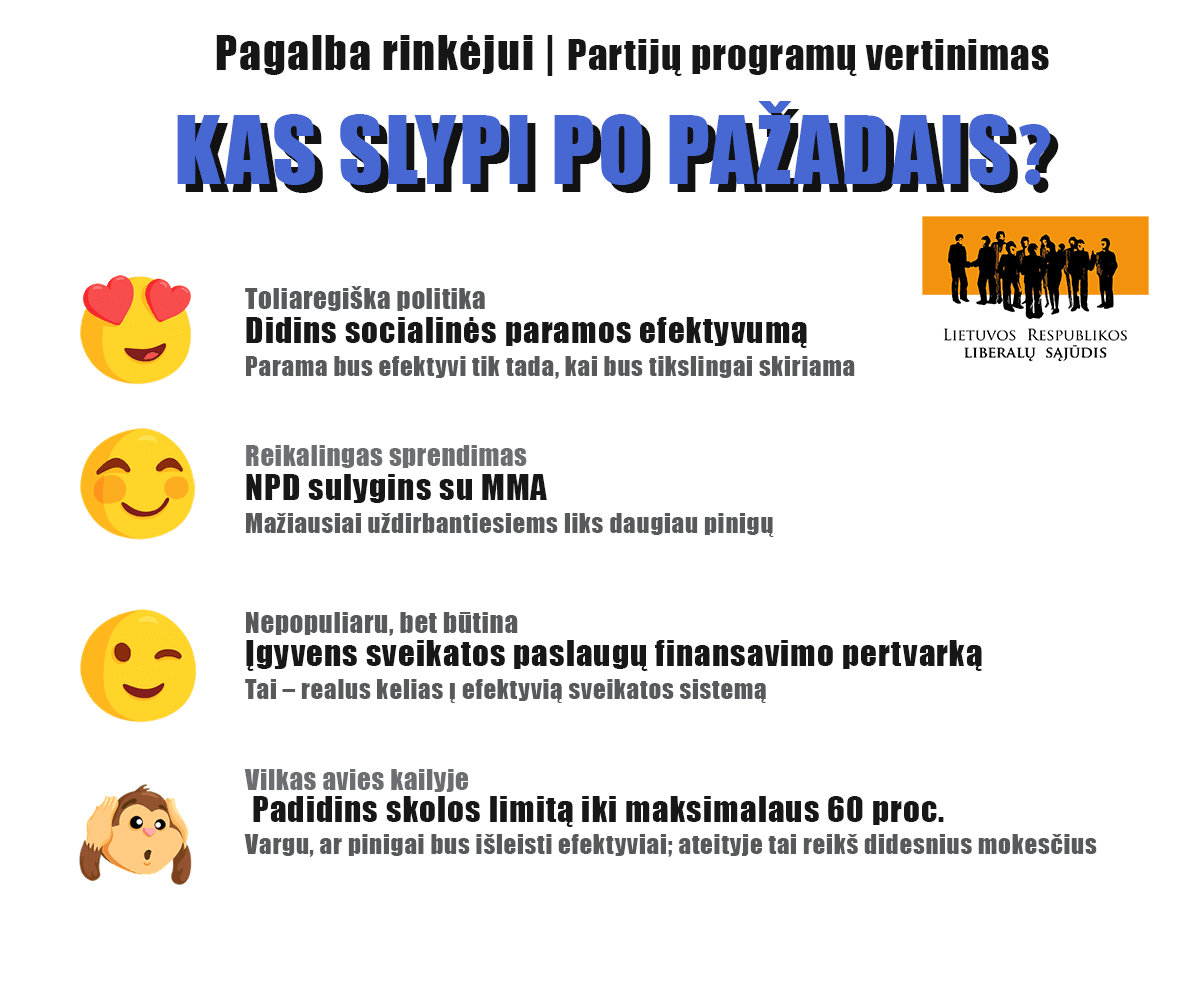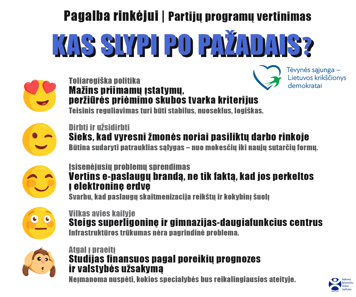 Artėjant 2020 Seimo rinkimams, Lietuvos laisvosios rinkos institutas išrinko ir įvertino ryškiausias partijų rinkimų programų nuostatas, kurių įgyvendinimas paveiktų žmonių atlyginimus, mokesčius, pasirinkimo laisvę ir kasdienį ekonominį gyvenimą. Kas slypi po partijų pažadais? Į kurias nuostatas rinkėjui atkreipti dėmesį, kaip jas vertinti?
